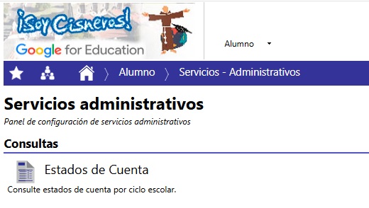 Una vez dentro del sistema Servoescolar Web, ingrese al menú ALUMNO, pulse la opción Administrativos y seleccione el módulo Estados de Cuenta.