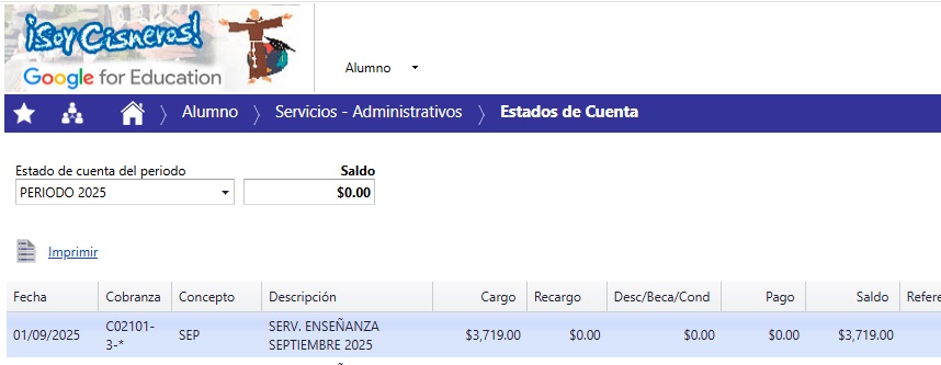 El alumno tiene la posibilidad de consultar su propio estado de cuenta para verificar el importe total pendiente de saldar. Incluso puede observar que conceptos han sido abonados y la referencia del comprobante de pago a cada uno de ellos.