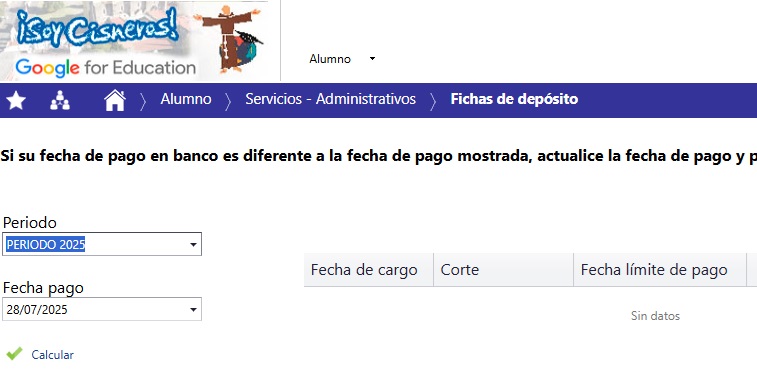 El alumno tiene la posibilidad de imprimir las fichas de depósito, para realizar pagos directamente en una institución bancaria. Además, puede consultar cual es el importe a saldar basándose en fechas tentativas de pago.