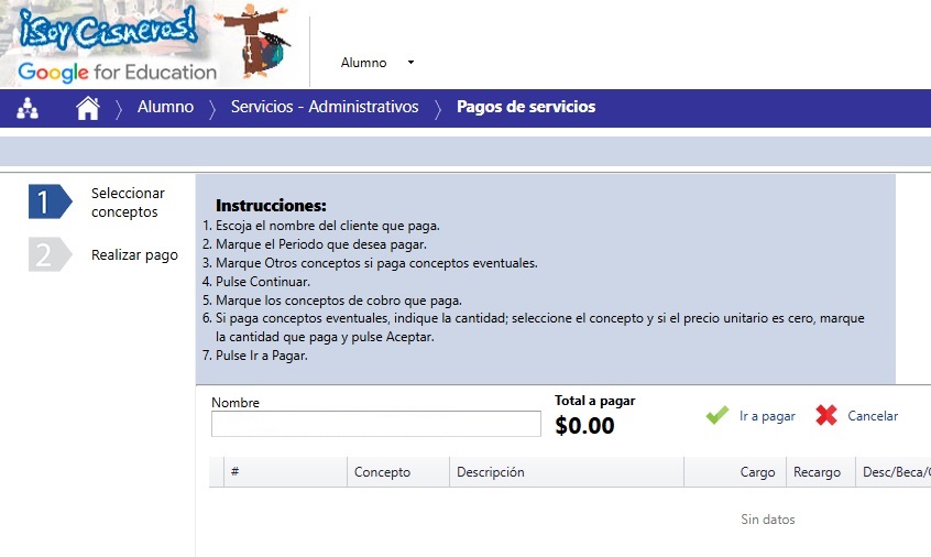 El alumno tiene la posibilidad de realizar pagos de conceptos de cobro directamente en la plataforma, usando una tarjeta de crédito y/o débito.